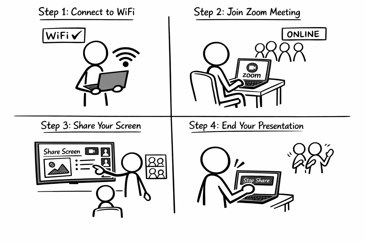 • In-person presentations are displayed on the room TV and shared across Zoom.