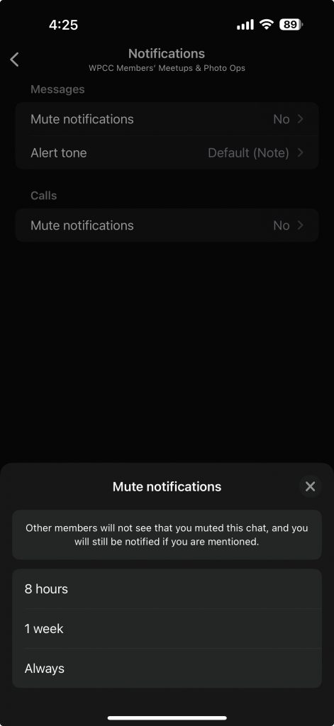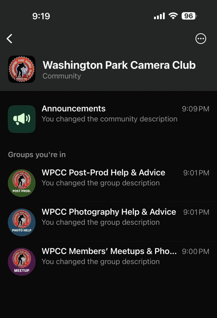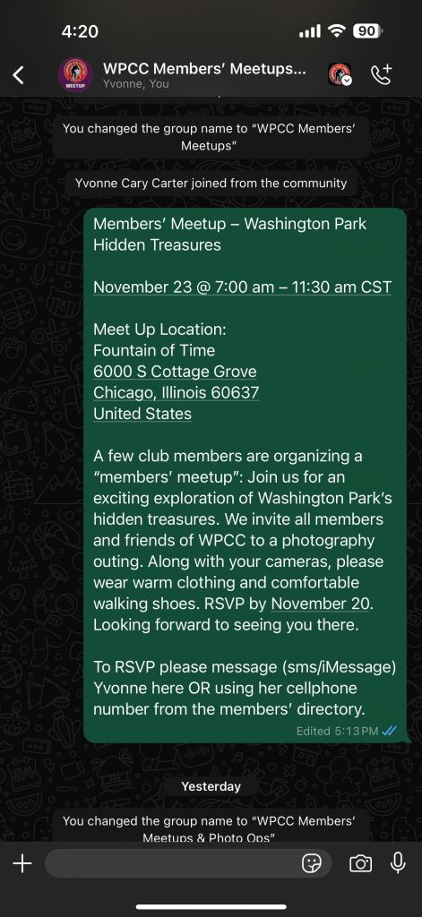 The “Washington Park Camera Club” Community has been established to facilitate communication among current members on the social media platform. This platform serves as a collaborative space for sharing knowledge, seeking assistance, and disseminating timely announcements. Participation is voluntary, and members are free to disengage from the WhatsApp communities, including the group and mute them at their convenience.